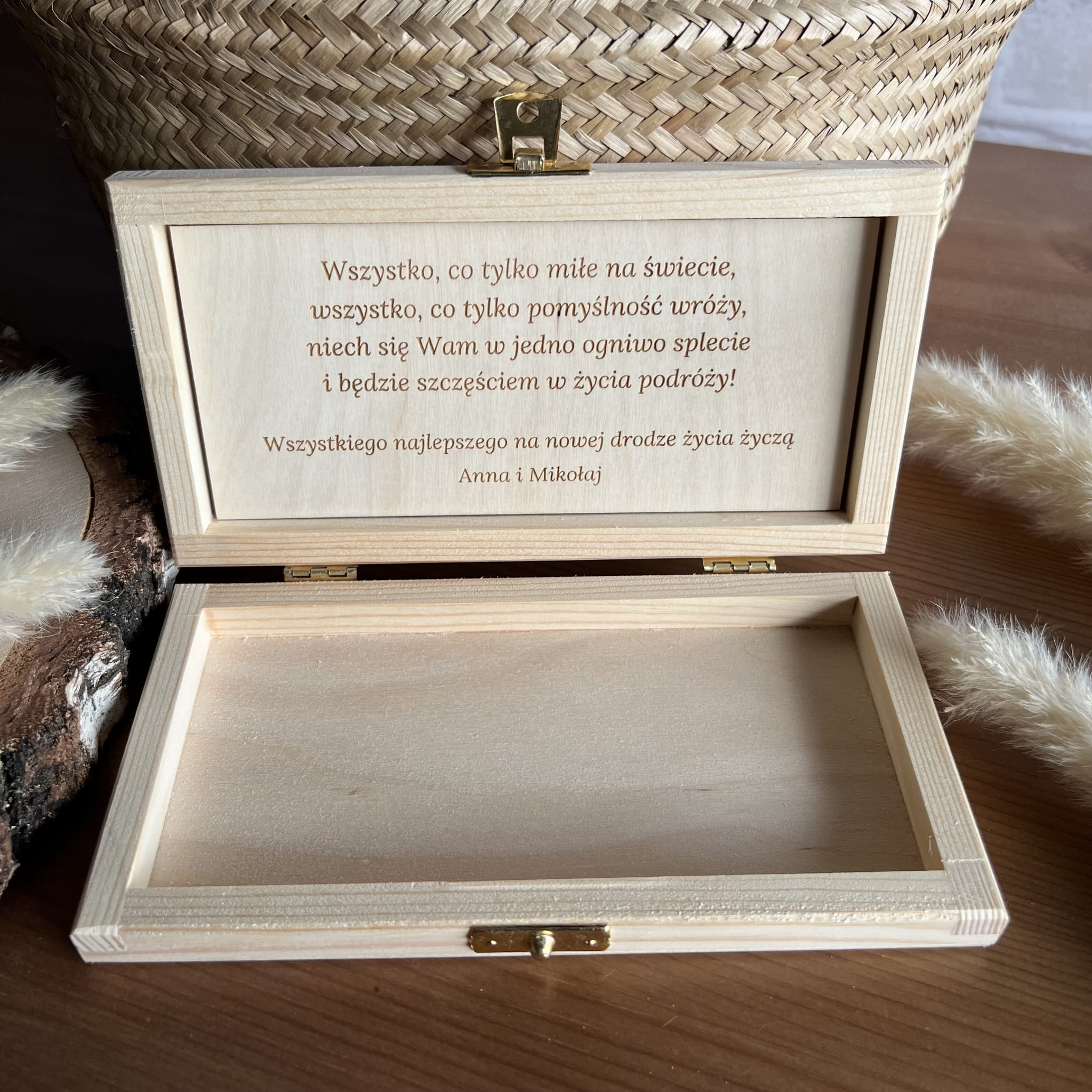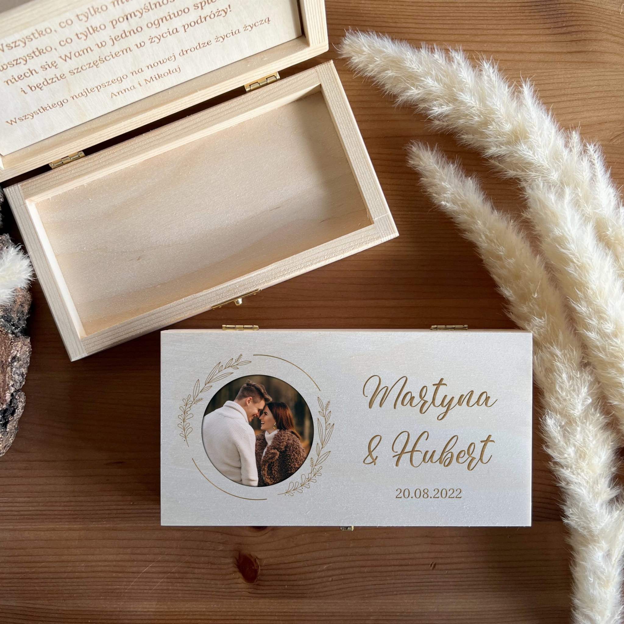 Zamykane, sosnowe pudełko ze zdjęciem i z grawerem z zewnątrz i życzeniami wewnątrz to idealny pomysł na prezent.