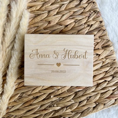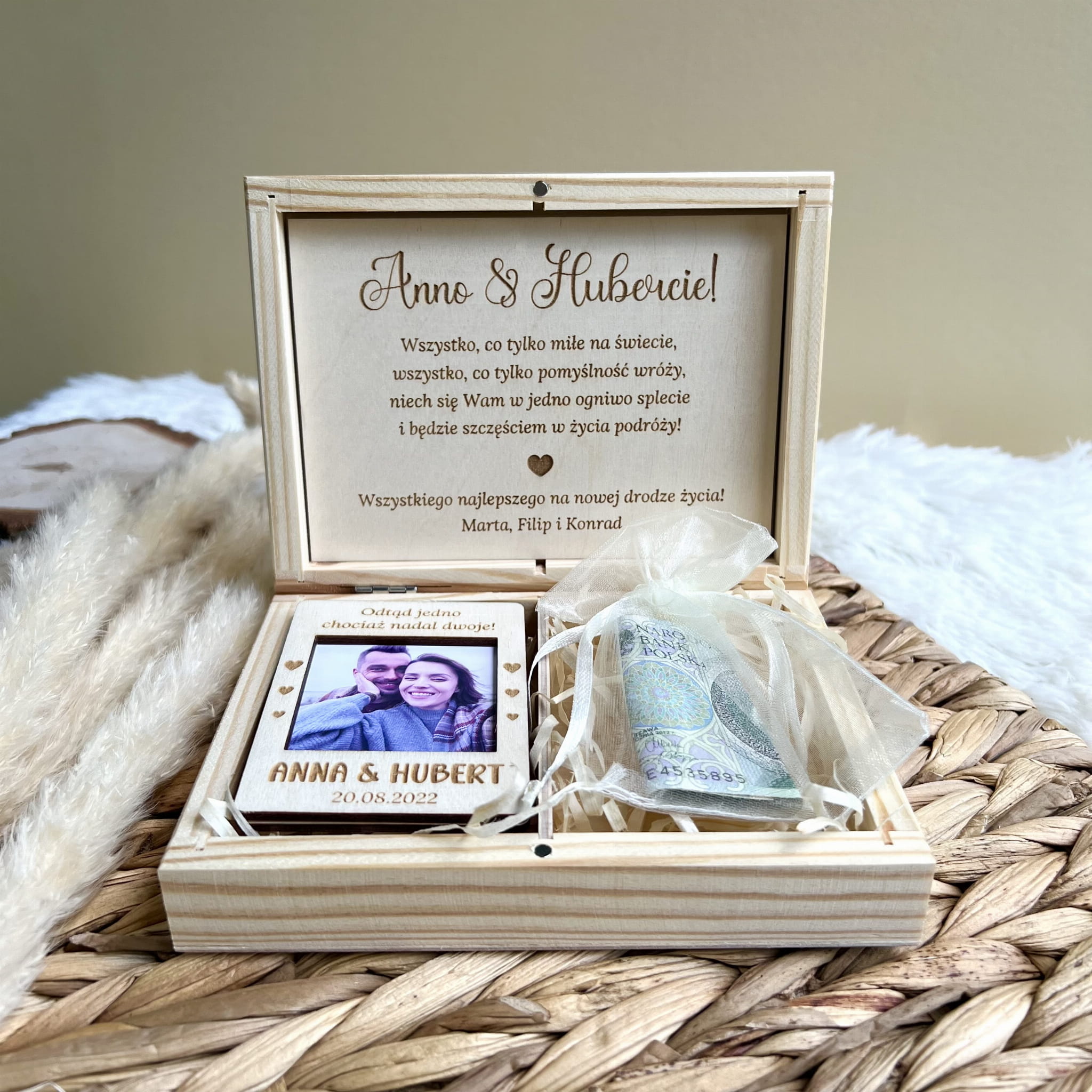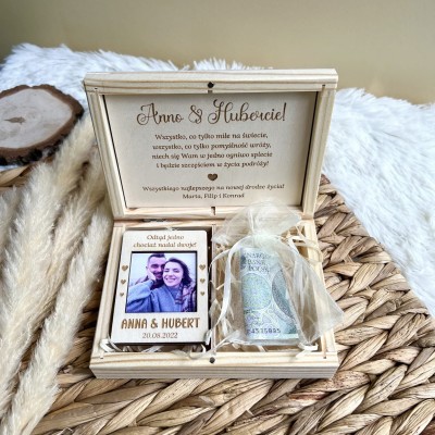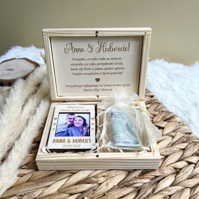 Zamykane, sosnowe pudełko z grawerem z zewnątrz i życzeniami wewnątrz to idealny pomysł na prezent ślubny.