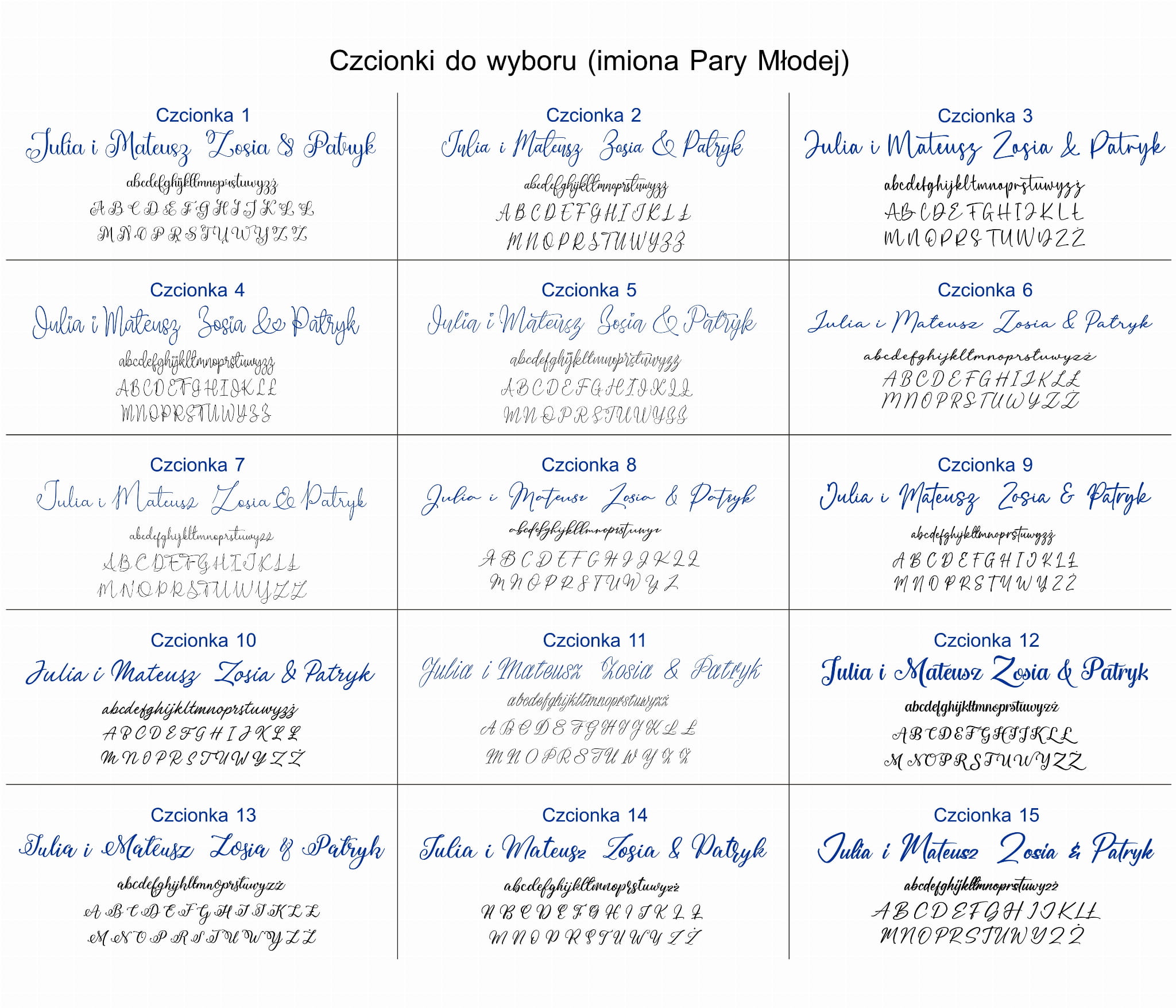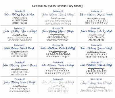 - 30 czcionek (imiona Pary Młodej na pudełku i nad życzeniami)