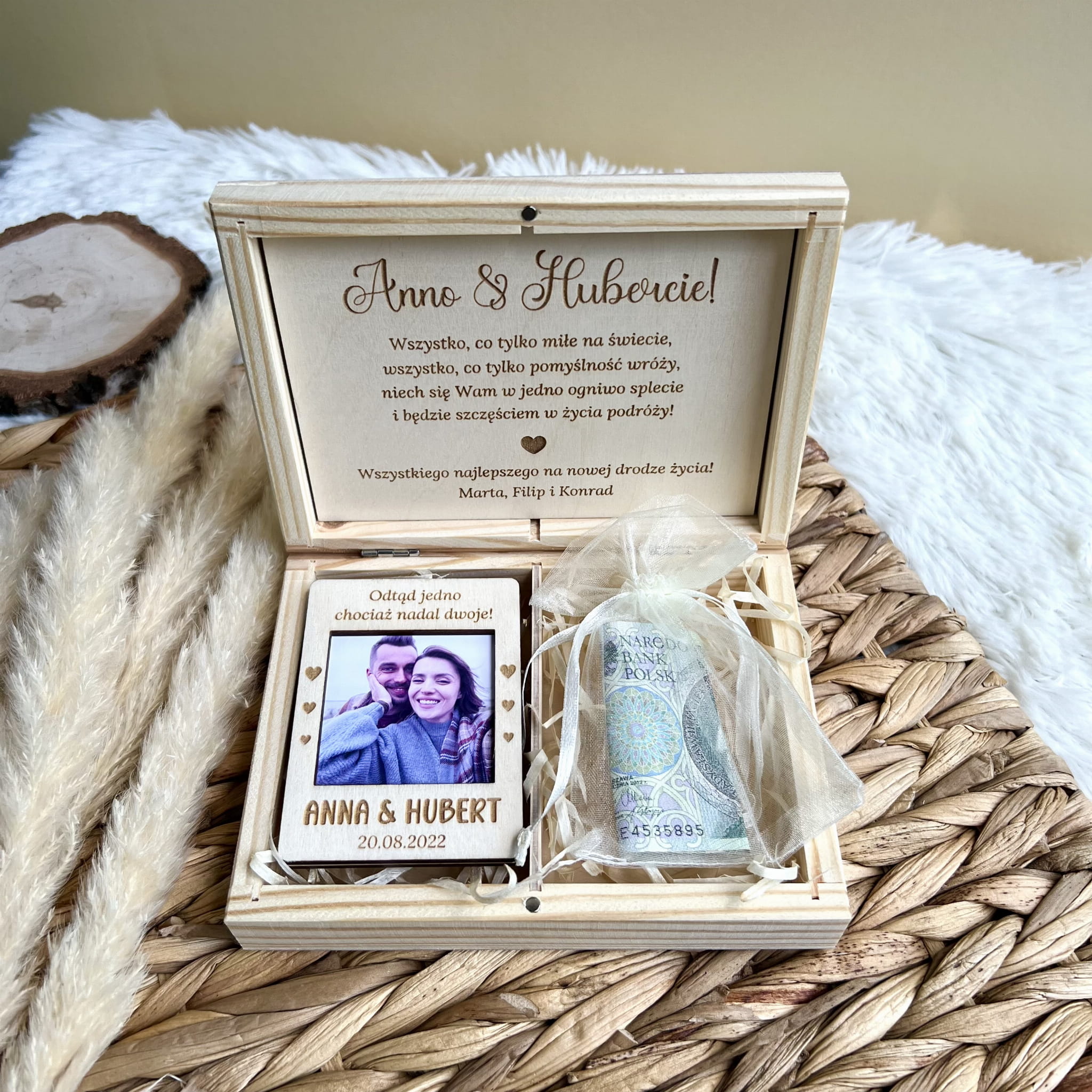 W środku znajduję się drewniany magnes ze zdjęciem i woreczek z organzy na pieniądze lub inny drobny upominek.