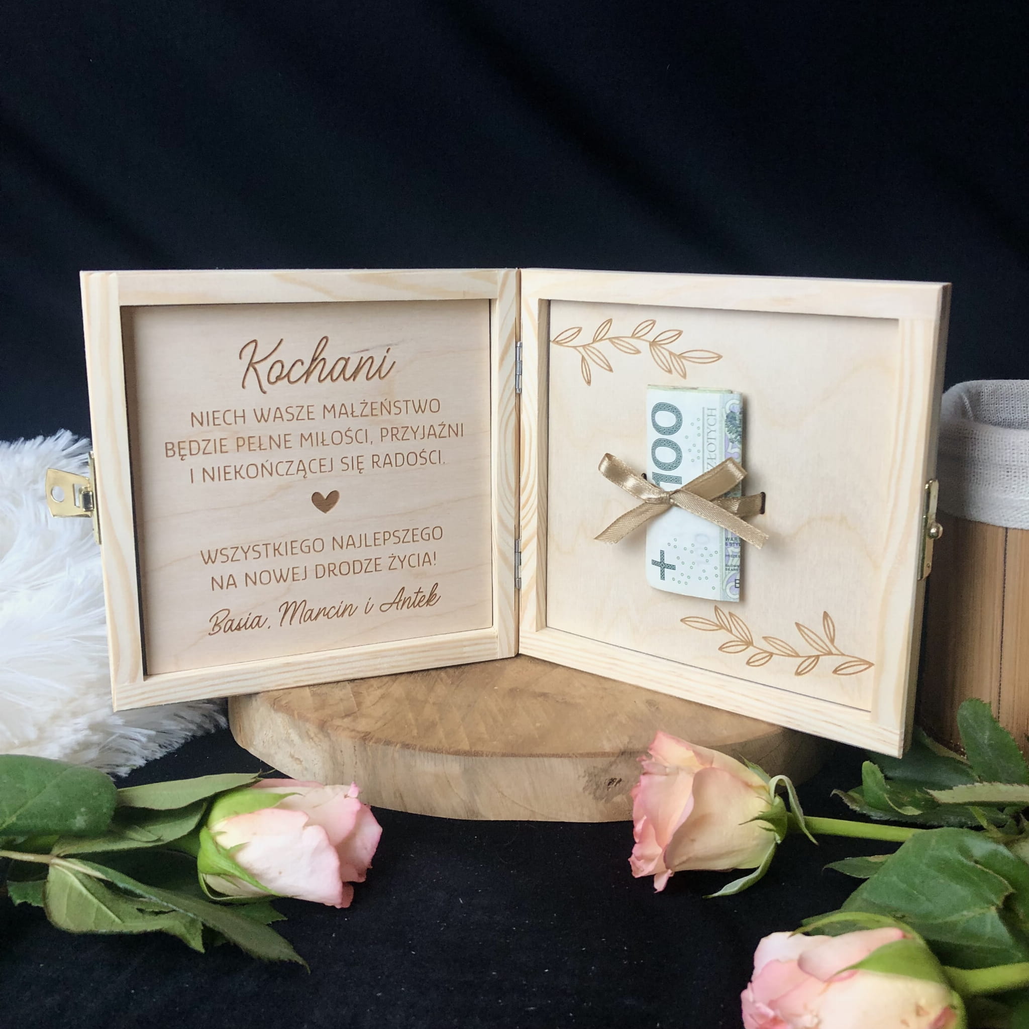 Zamykane, sosnowe pudełko z grawerem z zewnątrz i życzeniami wewnątrz to idealny pomysł na prezent.