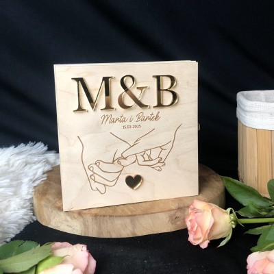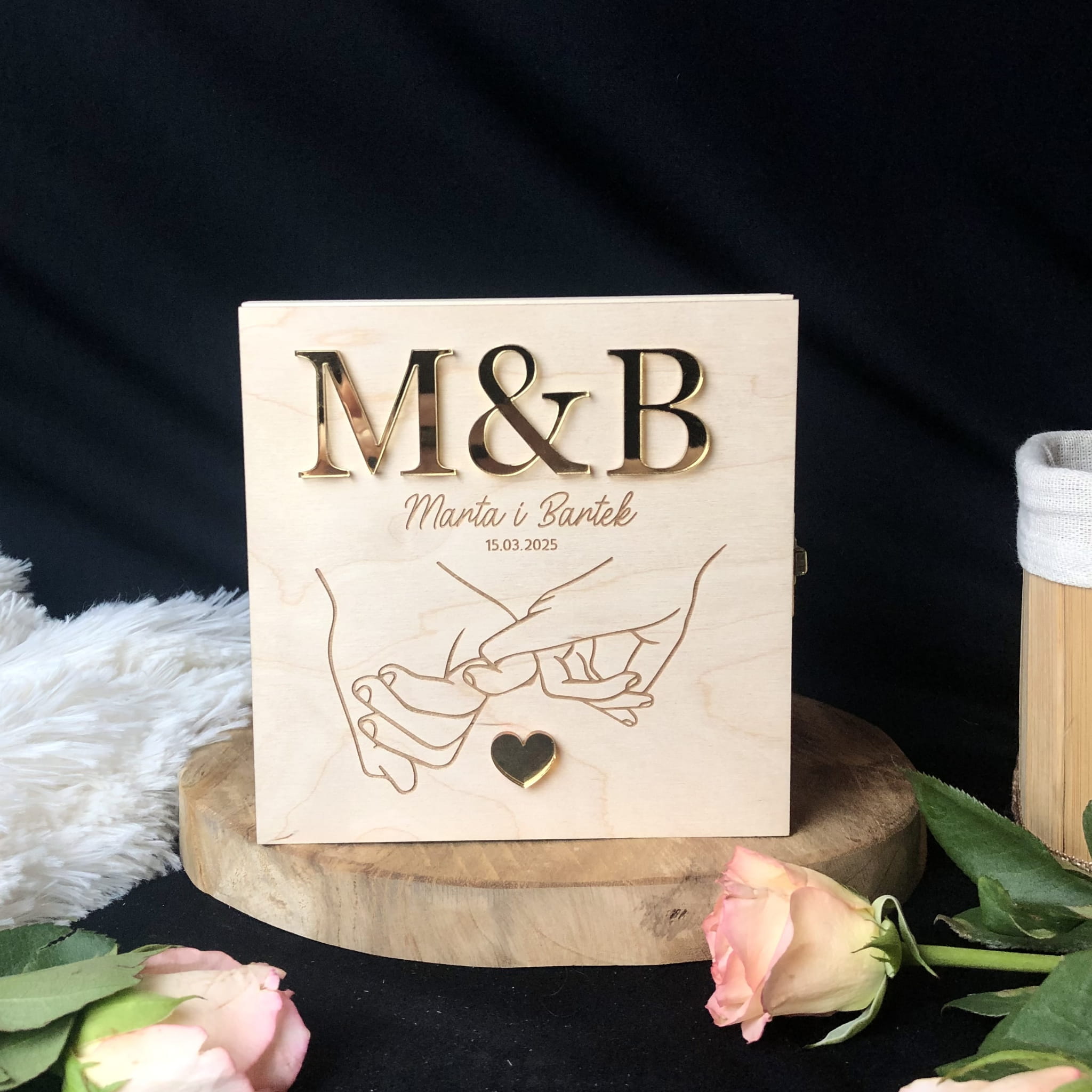 Na pudełku poza grawerem przyklejone są inicjały młodej pary i serduszko wykonane z plexi w kolorze złotego lustra.