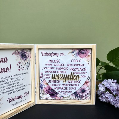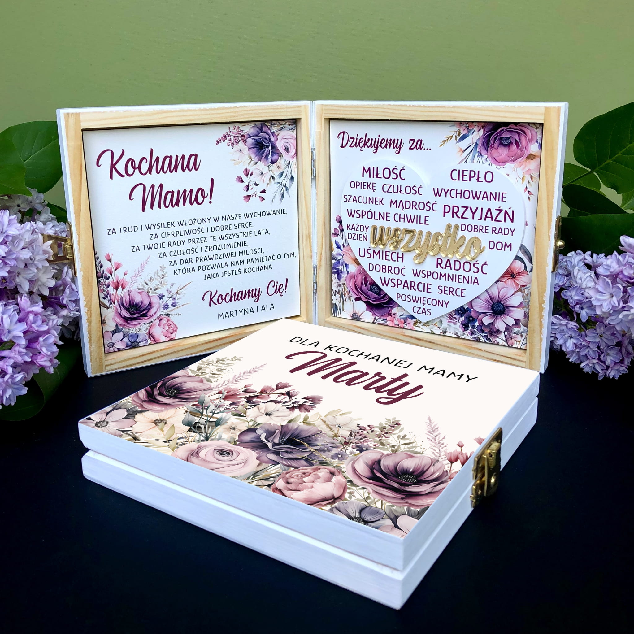 Zamykane, sosnowe pudełko z nadrukiem z zewnątrz i życzeniami wewnątrz to idealny pomysł na prezent.