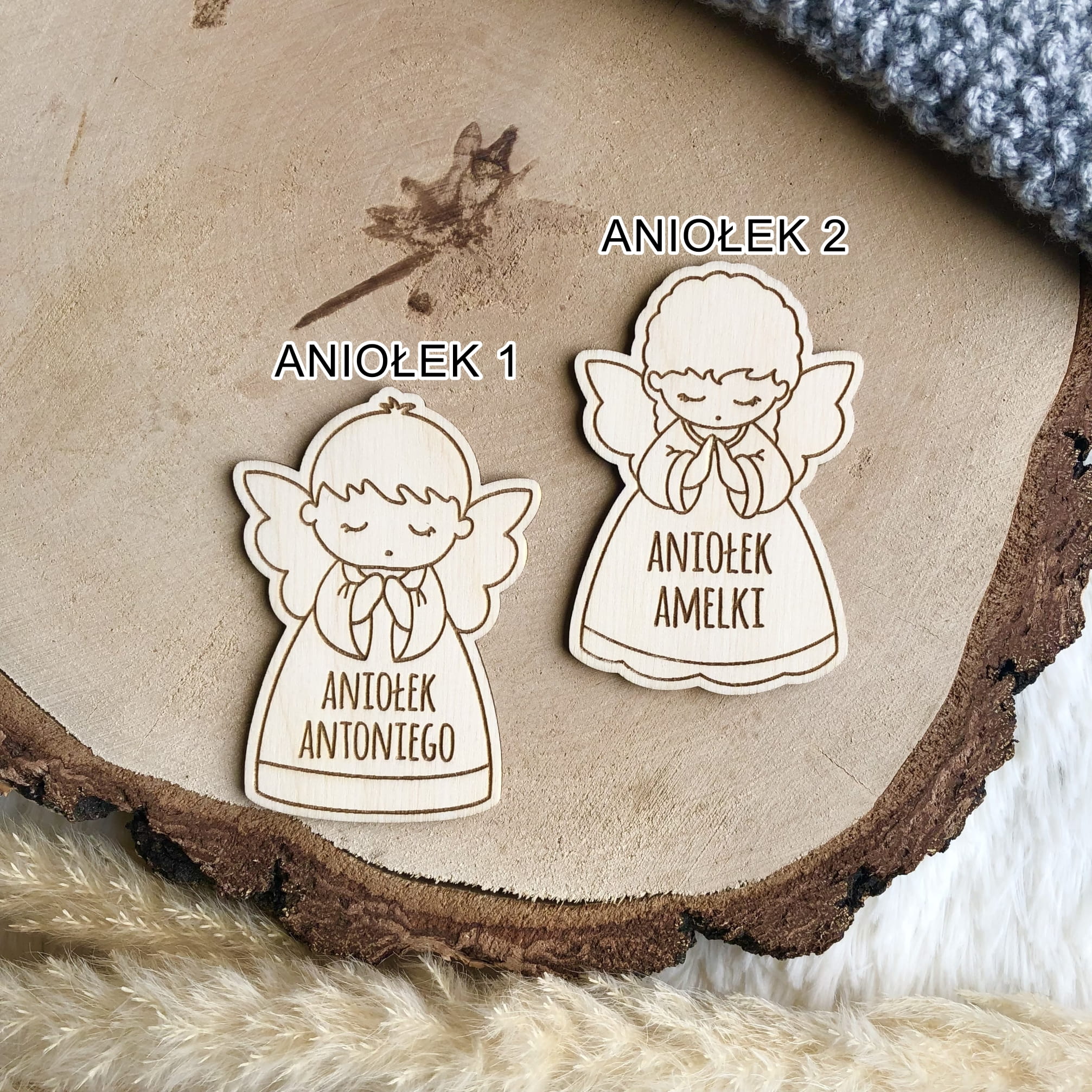 - Drewniany Aniołek z napisem "ANIOŁEK... imię dziecka"