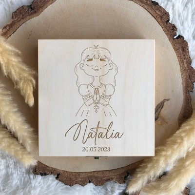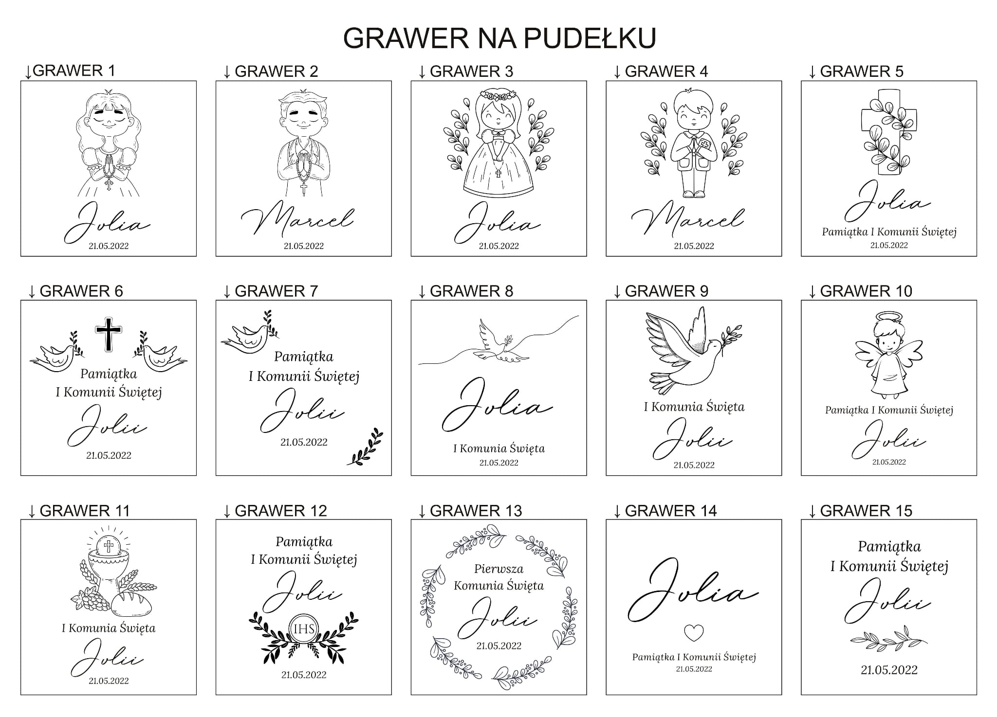 Pudełko ozdobione jest wbranym grawerem. Imię dziecka prosimy podawać w mianowniku (kto? co?) - Ania, Tomek, Maria, Basia itp.