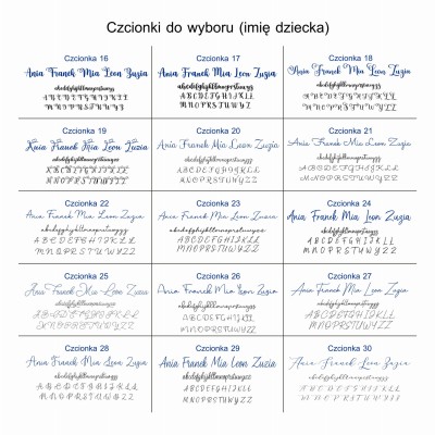 Czcionki do wyboru dotyczą imienia dziecka na pudełku i wewnątrz. Nie ma możliwości zmiany pozostałych krojów czcionek.
