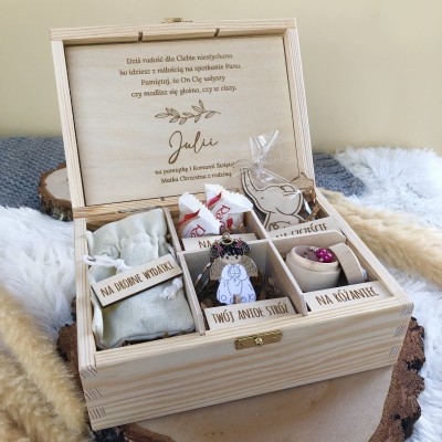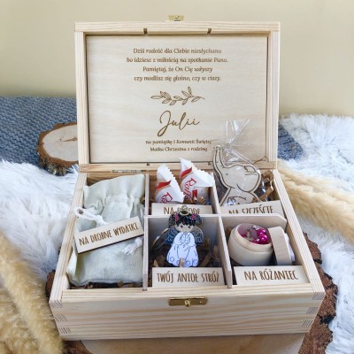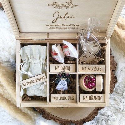 Wszystkie warianty do wyboru (życzenia, grawer na pudełku, czcionki, breloczki, tabliczki i różańce) pokazane są na zdjęciach w galerii produktu.