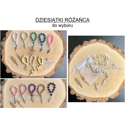Do wyboru kilka kolorów dziesiątki różańca. Drewniana dziesiątka różańca dostępna jest w 3 wzorach - wzór wysyłamy losowo. Dziesiątka różańca zapakowana jest w drewniane pudełeczko z białym krzyżykiem, biały długi różaniec w biały woreczek z organzy. Przy wyborze długie białego różańca - cena +7zł.