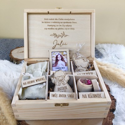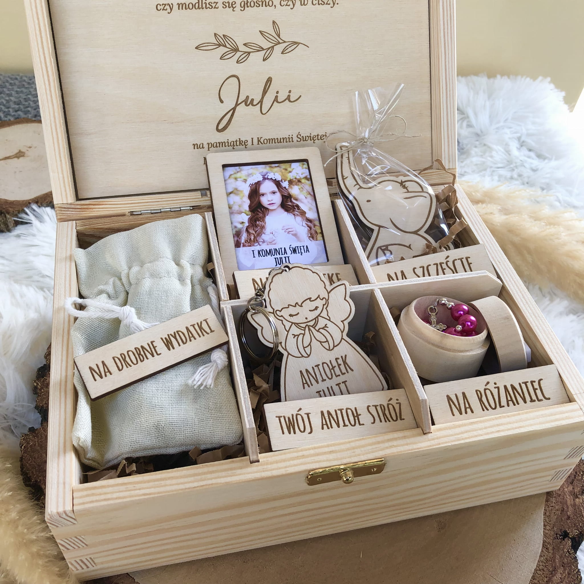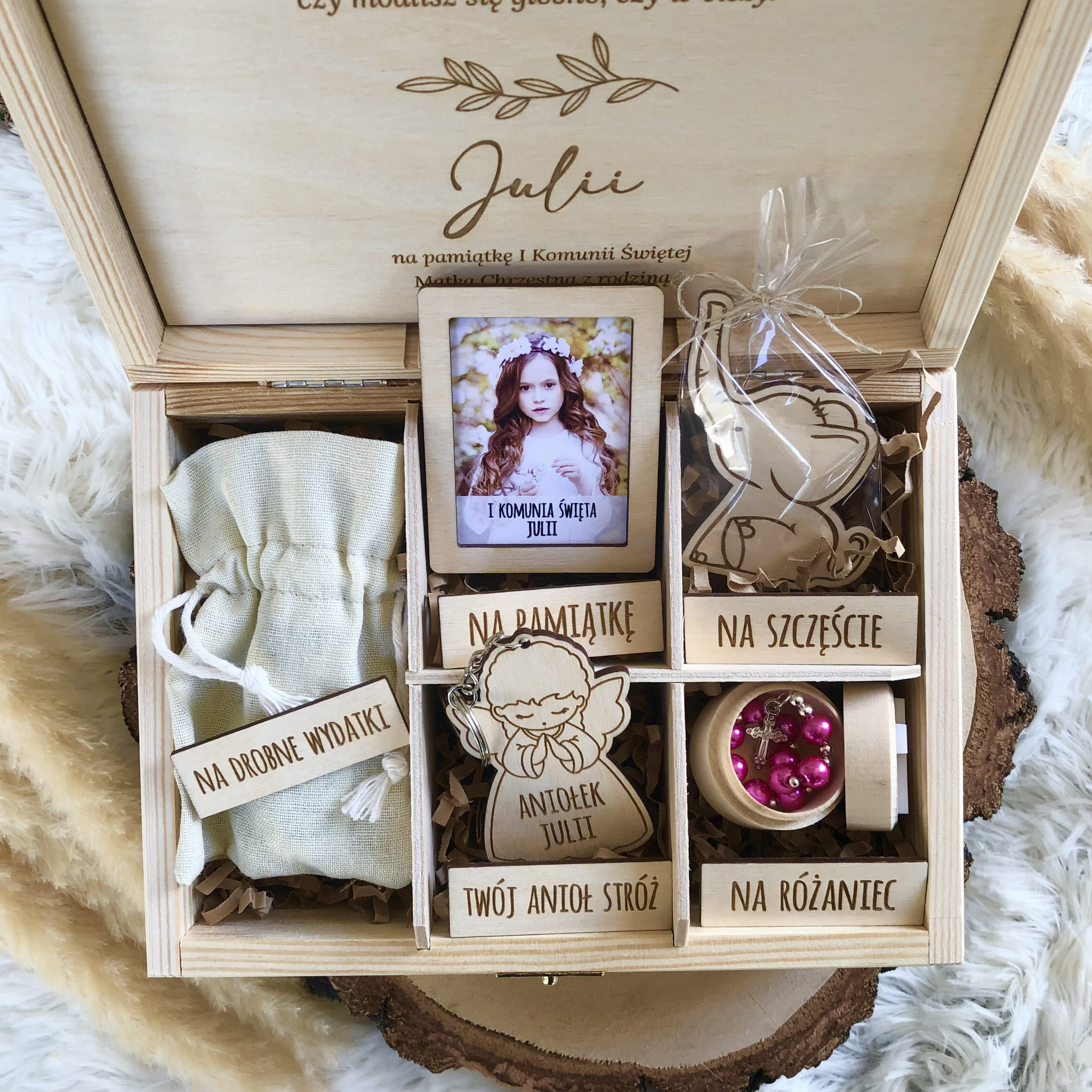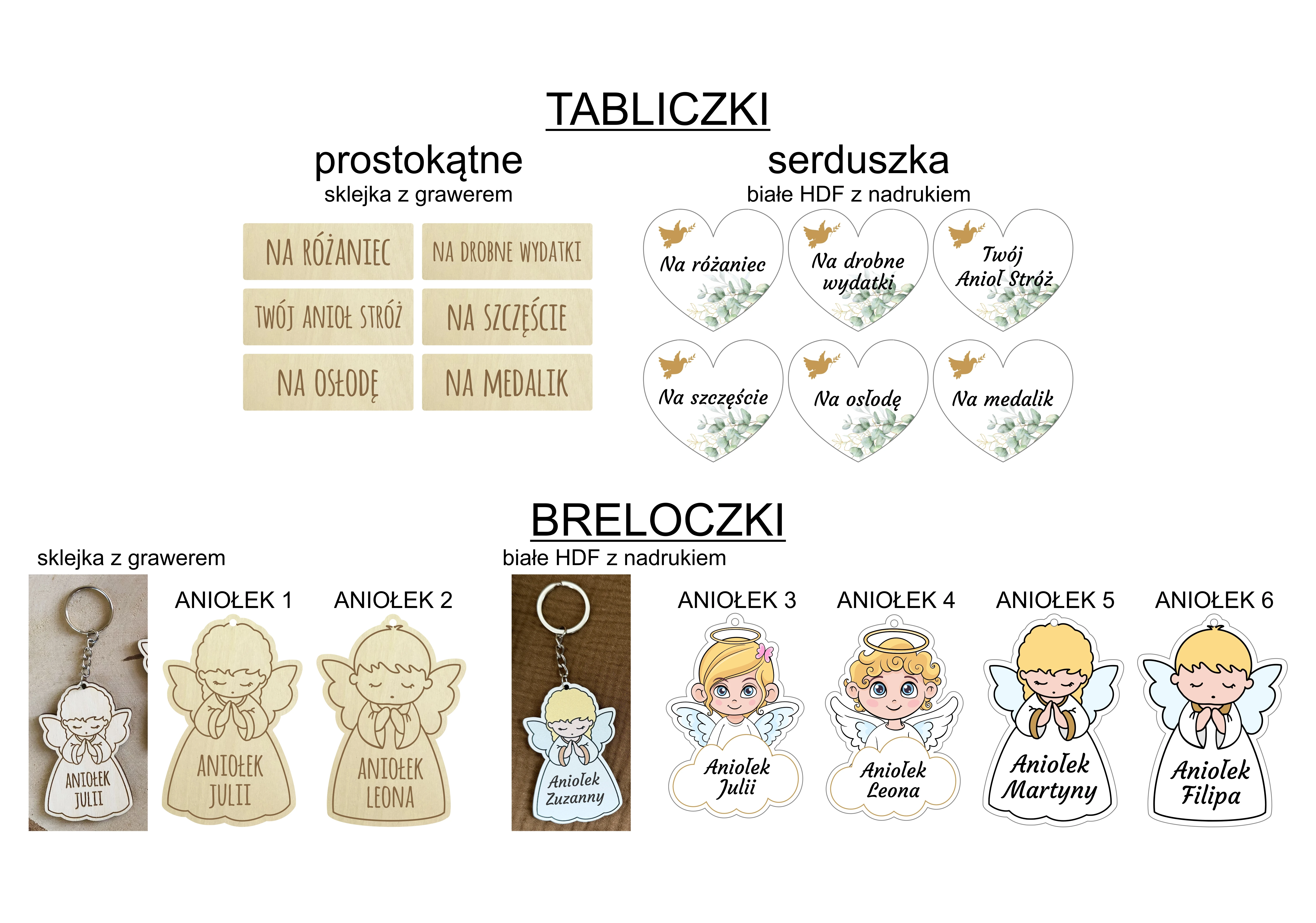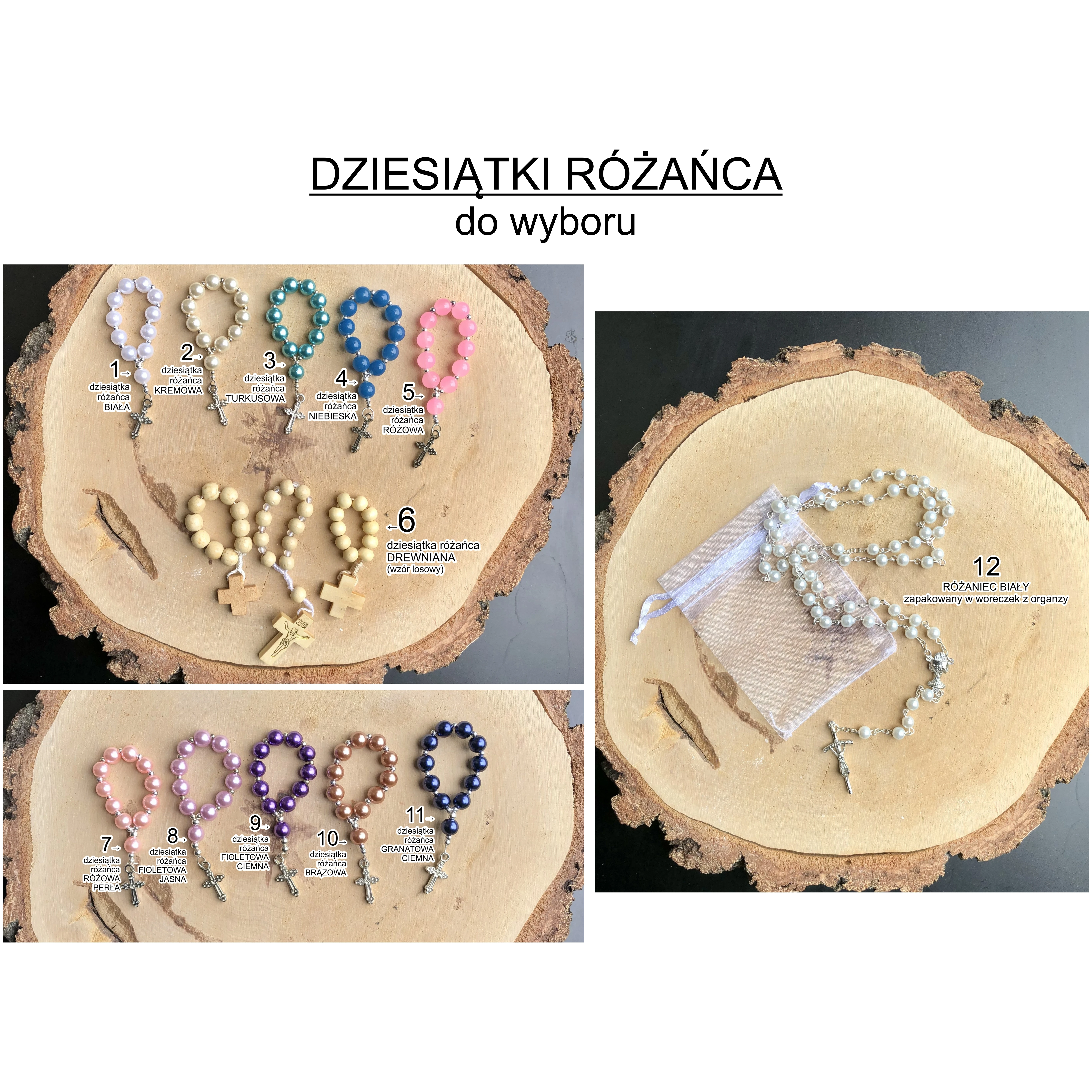 Wszystkie warianty do wyboru (życzenia, grawer na pudełku, czcionki, breloczki, tabliczki i różańce) pokazane są na zdjęciach w galerii produktu.