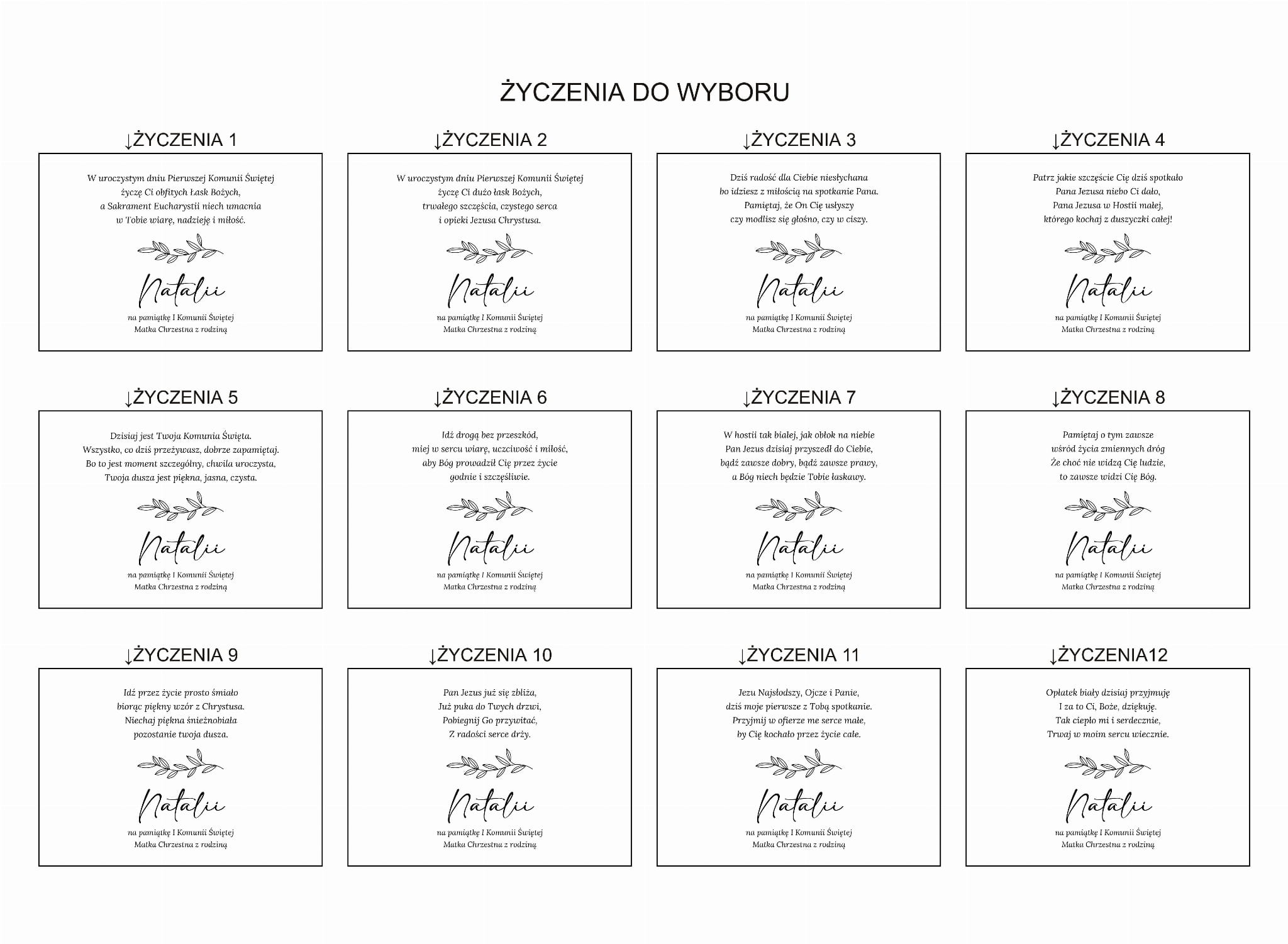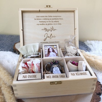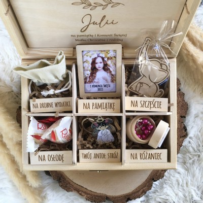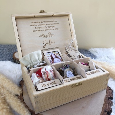 Wszystkie warianty do wyboru (życzenia, grawer na pudełku, czcionki, breloczki, tabliczki i różańce) pokazane są na zdjęciach w galerii produktu.
