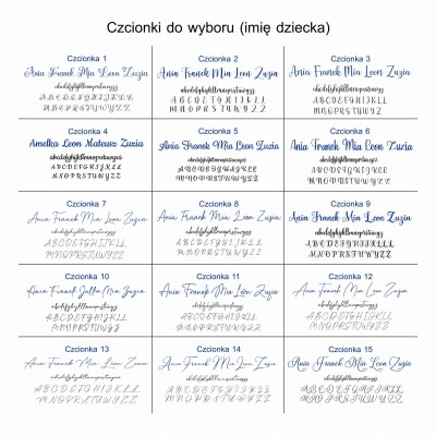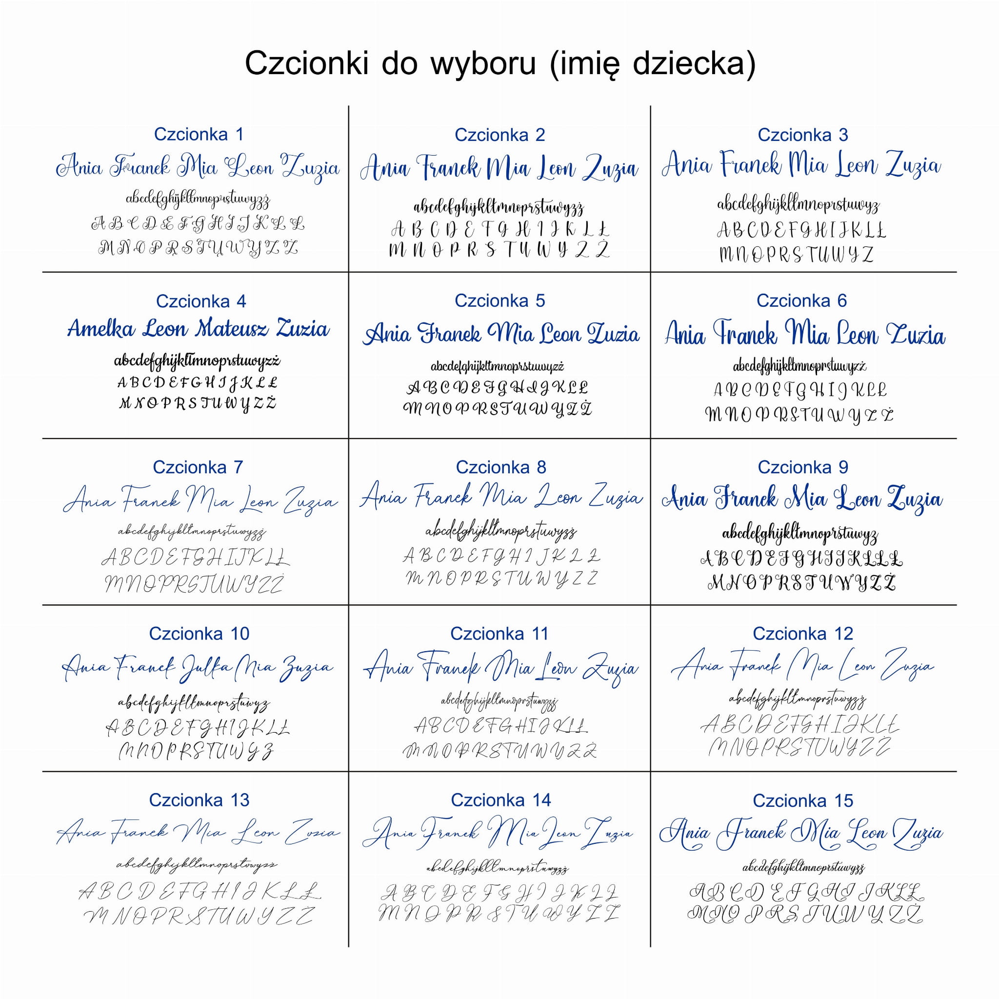 Czcionki do wyboru dotyczą imienia dziecka na pudełku i wewnątrz. Nie ma możliwości zmiany pozostałych krojów czcionek.