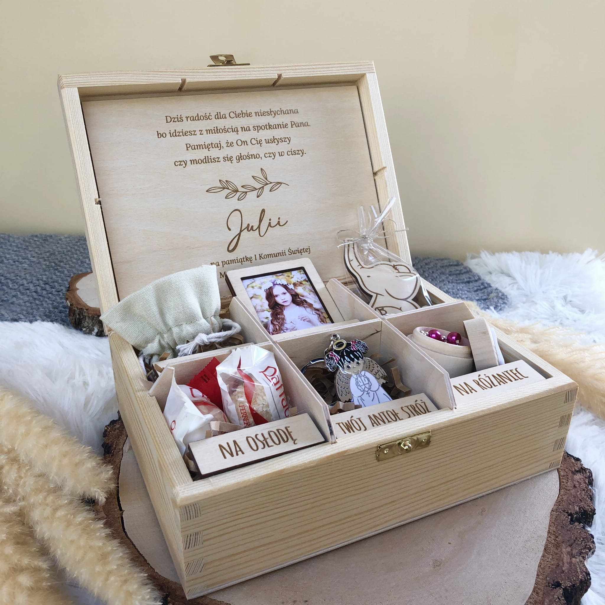 Pudełko z grawerem z zewnątrz i życzeniami wewnątrz. Wymiary pudełka: 22 cm x 16 cm x 8 cm. Materiał: naturalne drewno sosnowe + sklejka. Grawer wykonany precyzyjną techniką laserową. Życzenia są wygrawerowane na sklejce drewnianej i wklejone do pudełka. W każdej przegródce oprócz produktu jest wypełnie w 4 kolorach do wyboru (brązowe ECO, różowe, niebieskie lub czarne).