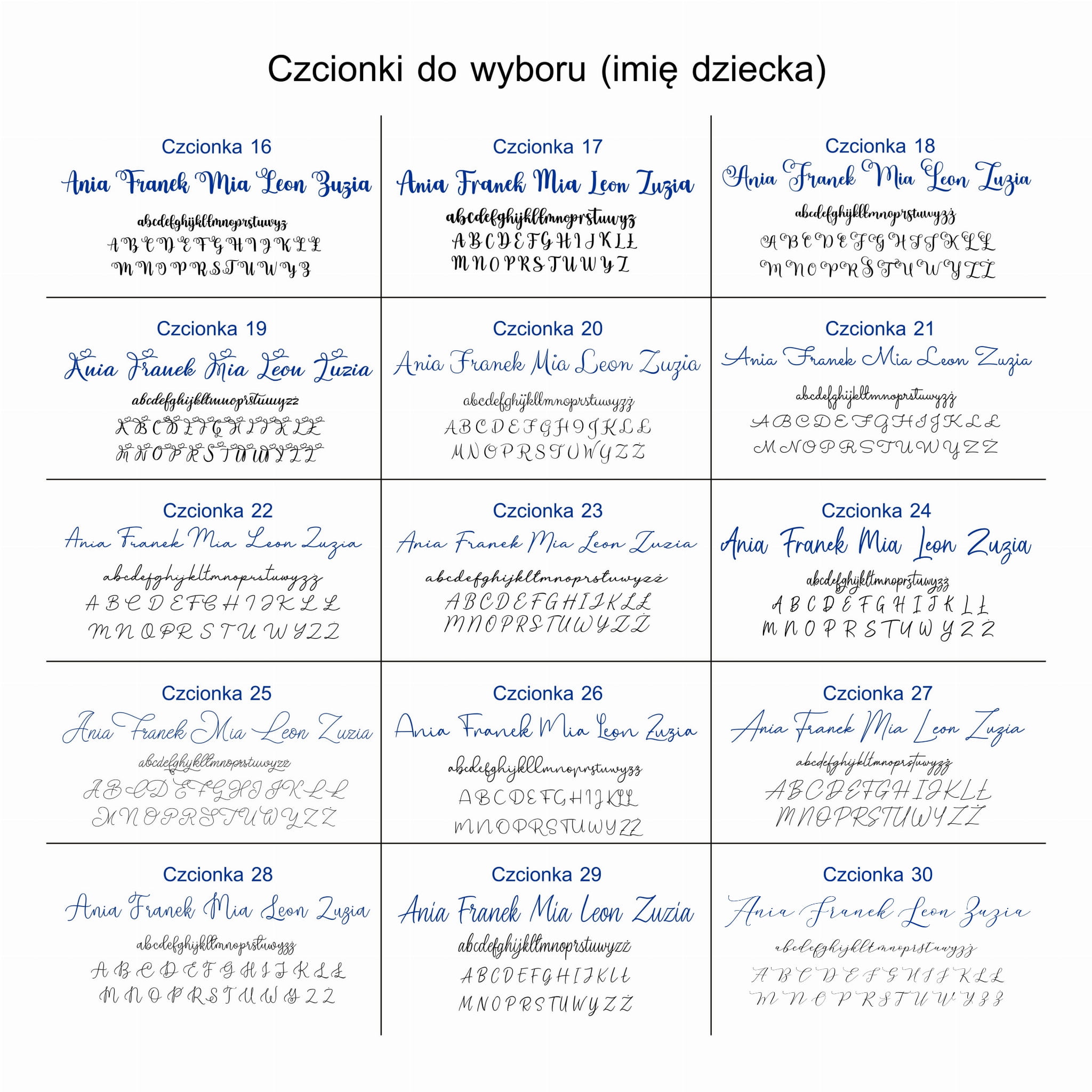 Czcionki do wyboru dotyczą imienia dziecka na pudełku, pod życzeniami i na tabliczce z modlitwą. Nie ma możliwości zmiany pozostałych krojów czcionek.