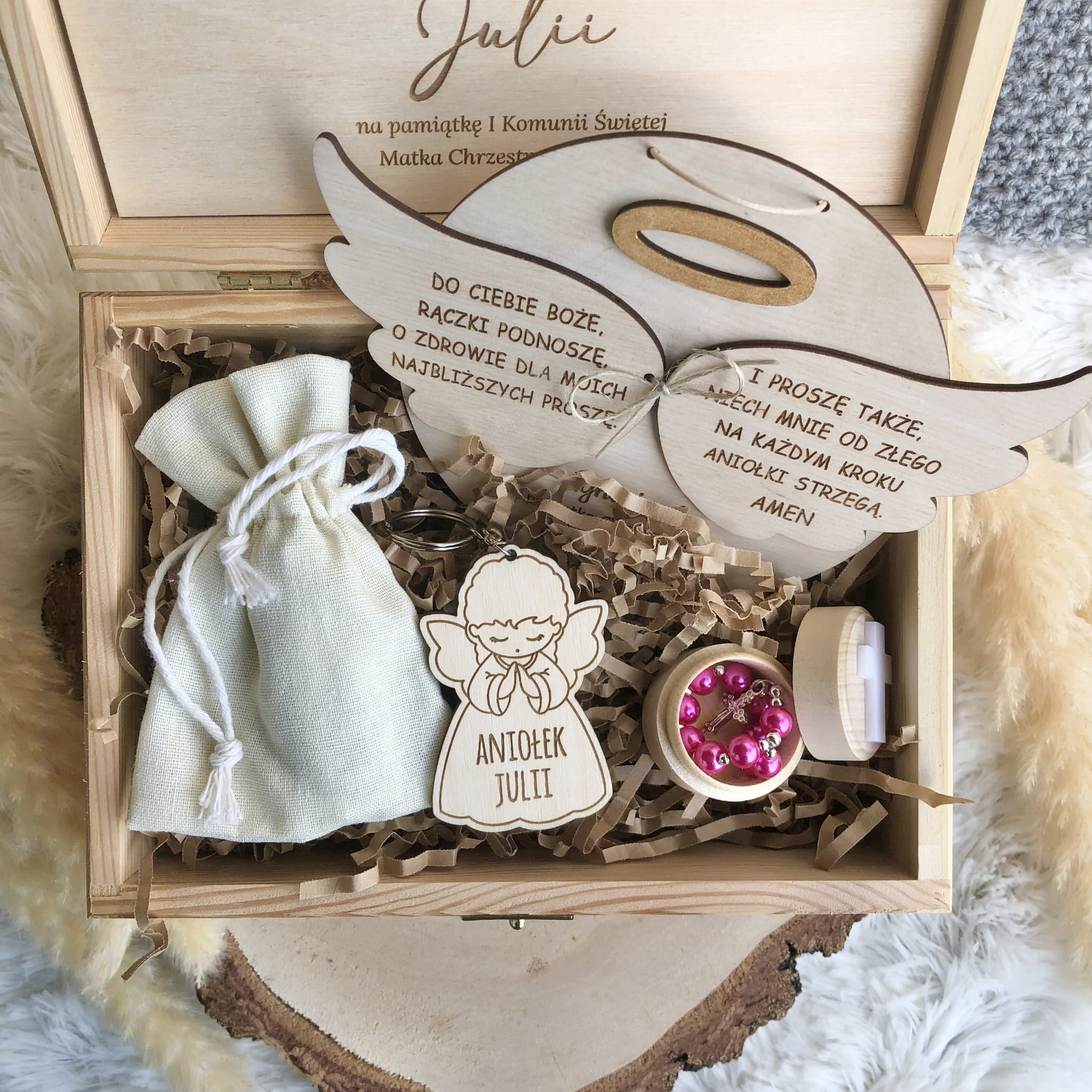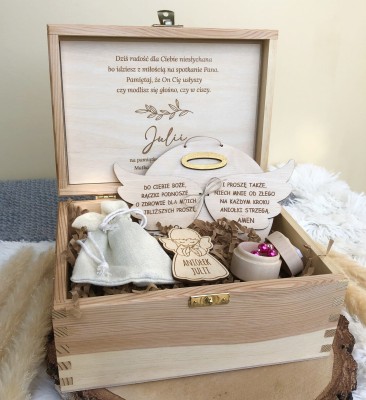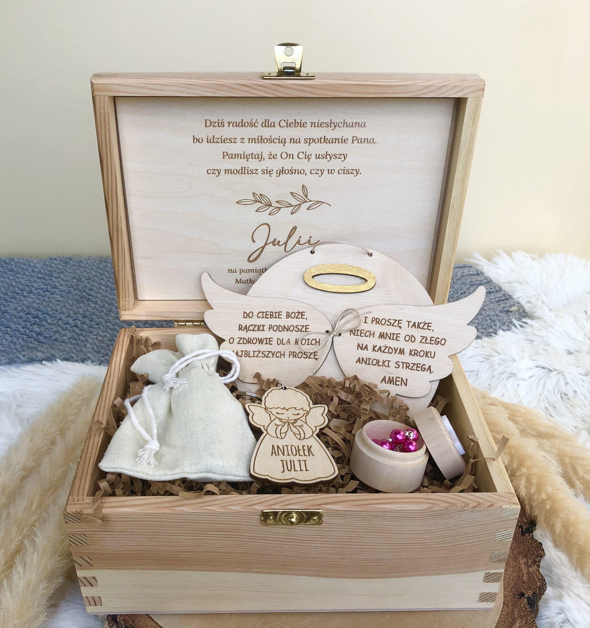 Pudełko ozdobione jest wbranym grawerem. Imię dziecka prosimy podawać w mianowniku (kto? co?) - Ania, Tomek, Maria, Basia itp.