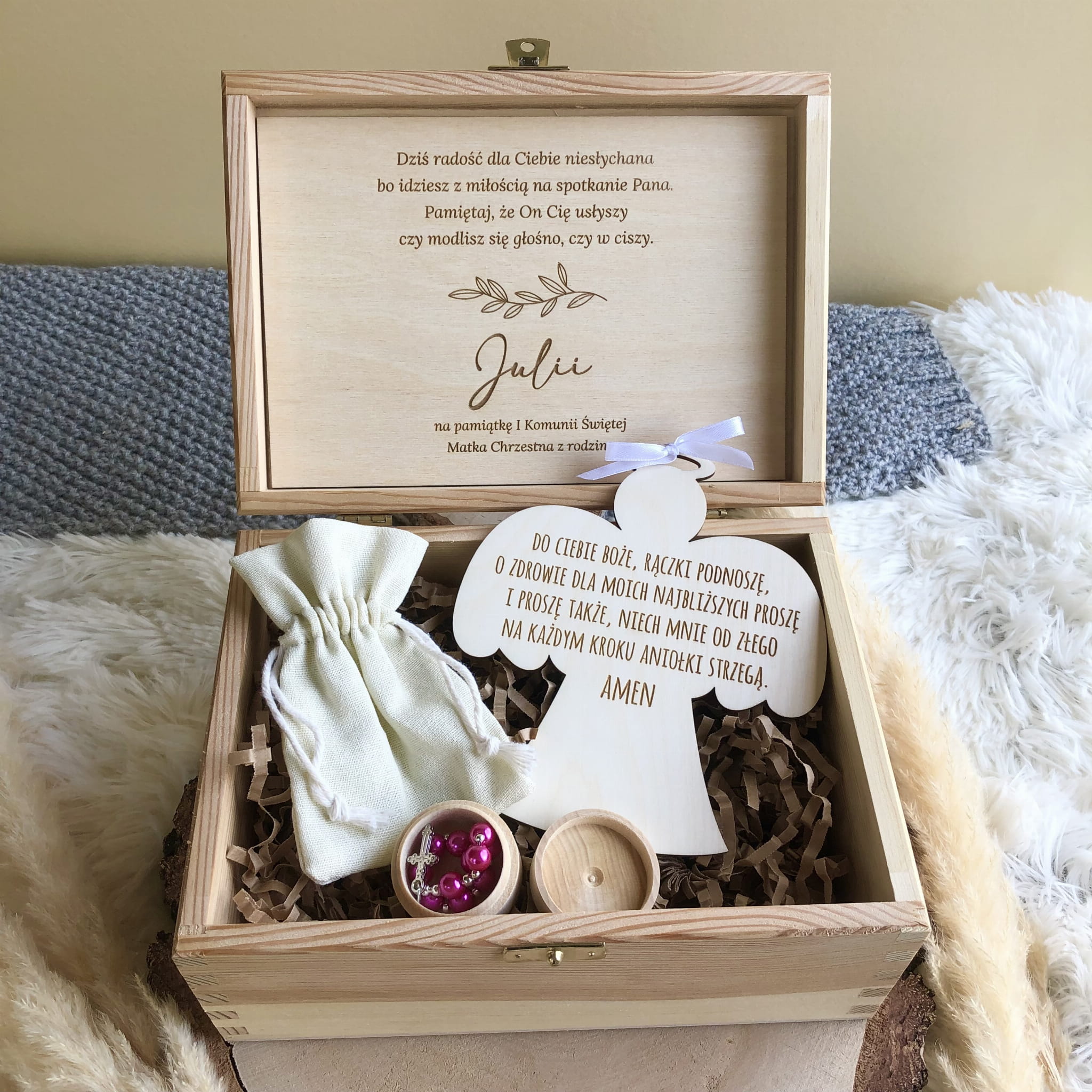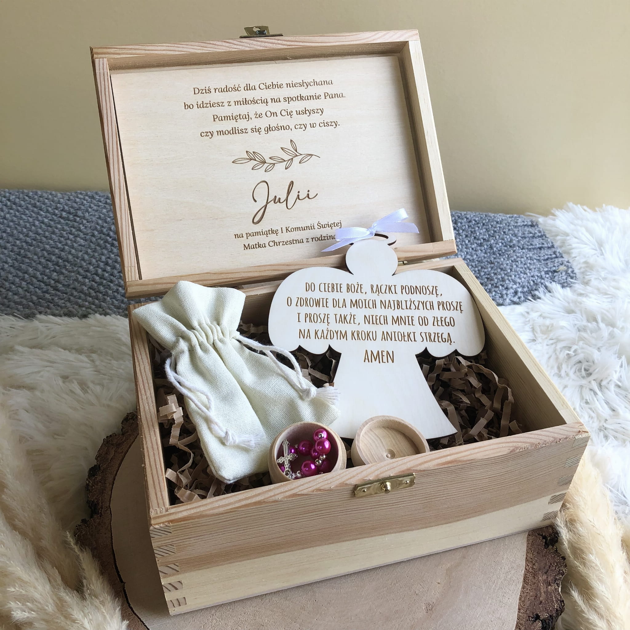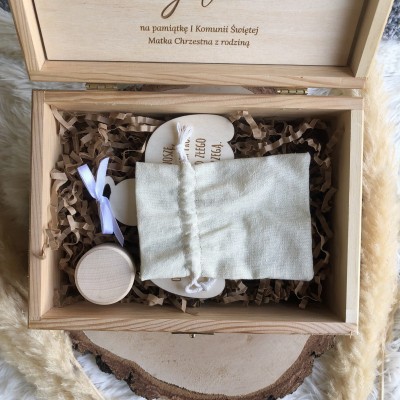 Pudełko z grawerem z zewnątrz i życzeniami wewnątrz. Wymiary pudełka: 22 cm x 16 cm. Materiał: naturalne drewno sosnowe + sklejka. Grawer wykonany precyzyjną techniką laserową. Życzenia są wygrawerowane na sklejce drewnianej i wklejone do pudełka. W pudełku oprócz produktów jest wypełnie w 4 kolorach do wyboru (brązowe ECO, różowe, niebieskie lub czarne).
