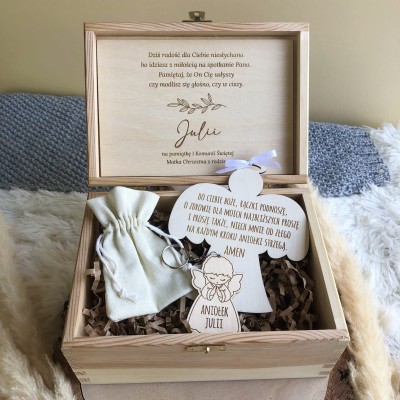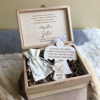 Pudełko ozdobione jest wbranym grawerem. Imię dziecka prosimy podawać w mianowniku (kto? co?) - Ania, Tomek, Maria, Basia itp.
