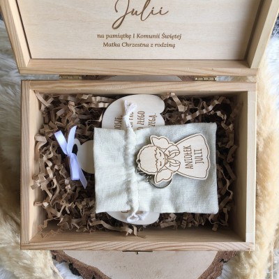 Pudełko z grawerem z zewnątrz i życzeniami wewnątrz. Wymiary pudełka: 22 cm x 16 cm. Materiał: naturalne drewno sosnowe + sklejka. Grawer wykonany precyzyjną techniką laserową. Życzenia są wygrawerowane na sklejce drewnianej i wklejone do pudełka. W pudełku oprócz produktów jest wypełnie w 4 kolorach do wyboru (brązowe ECO, różowe, niebieskie lub czarne).