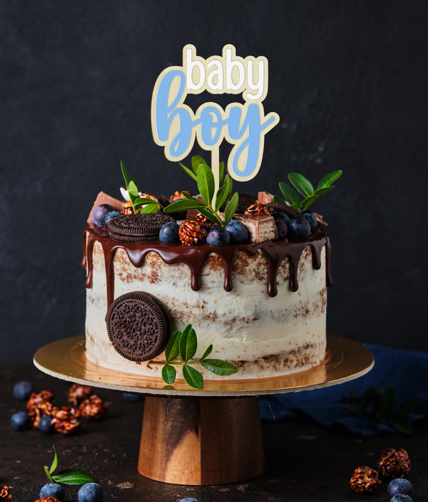 Topper składa się z bazy wykonanej ze sklejki brzozowej oraz przyklejonych literek z białego akrylu. Słowo boy pomalowane jest na niebieski kolor.