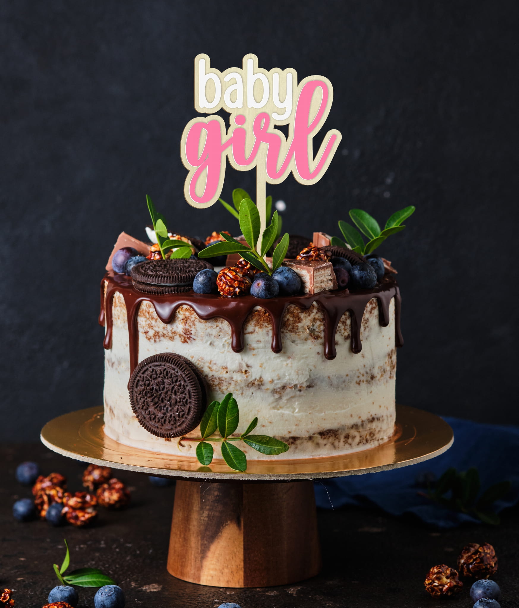 Topper składa się z bazy wykonanej ze sklejki brzozowej oraz przyklejonych literek z białego akrylu. Słowo girl pomalowane jest na różowy kolor.