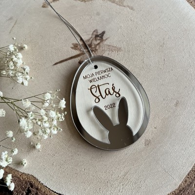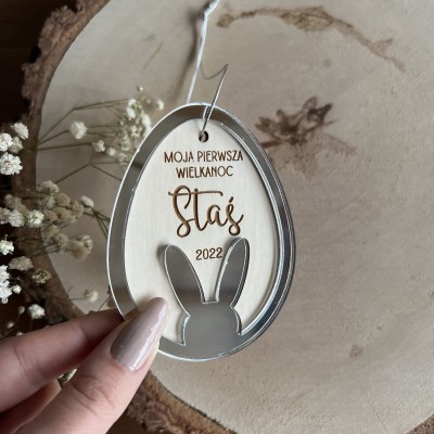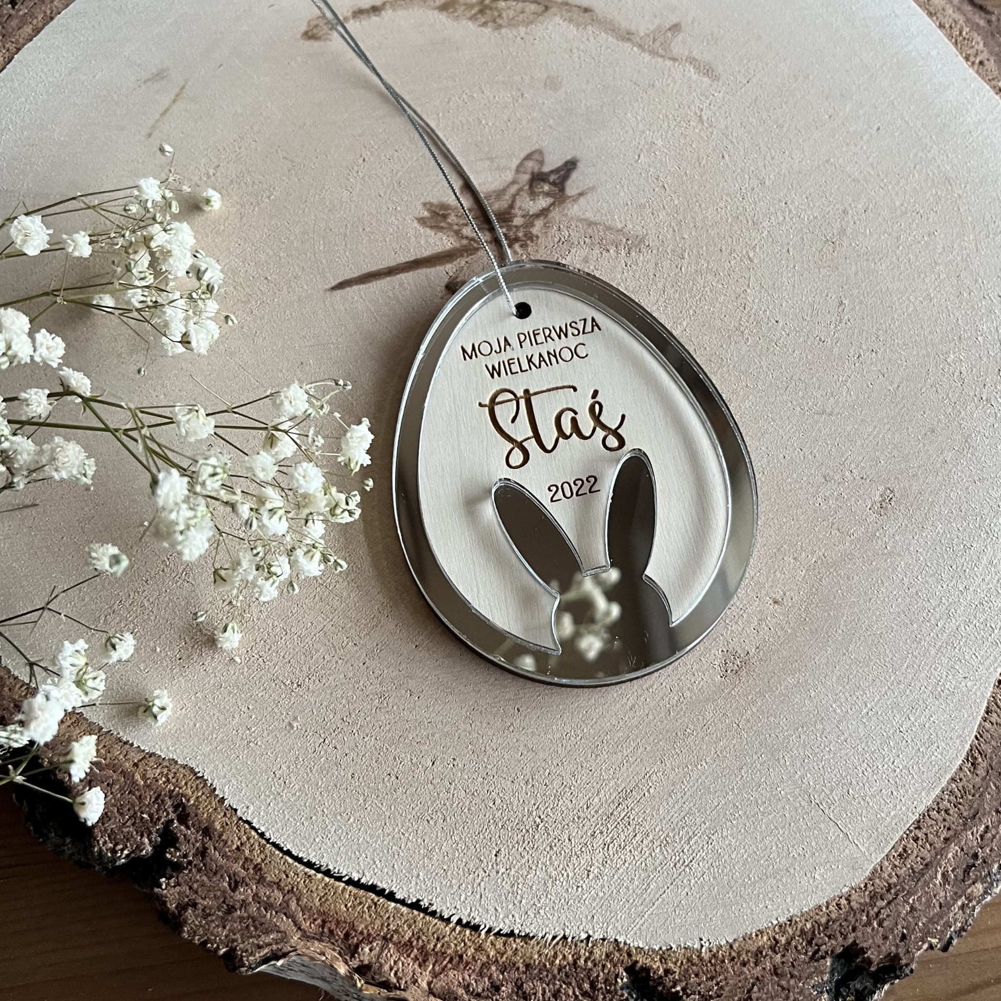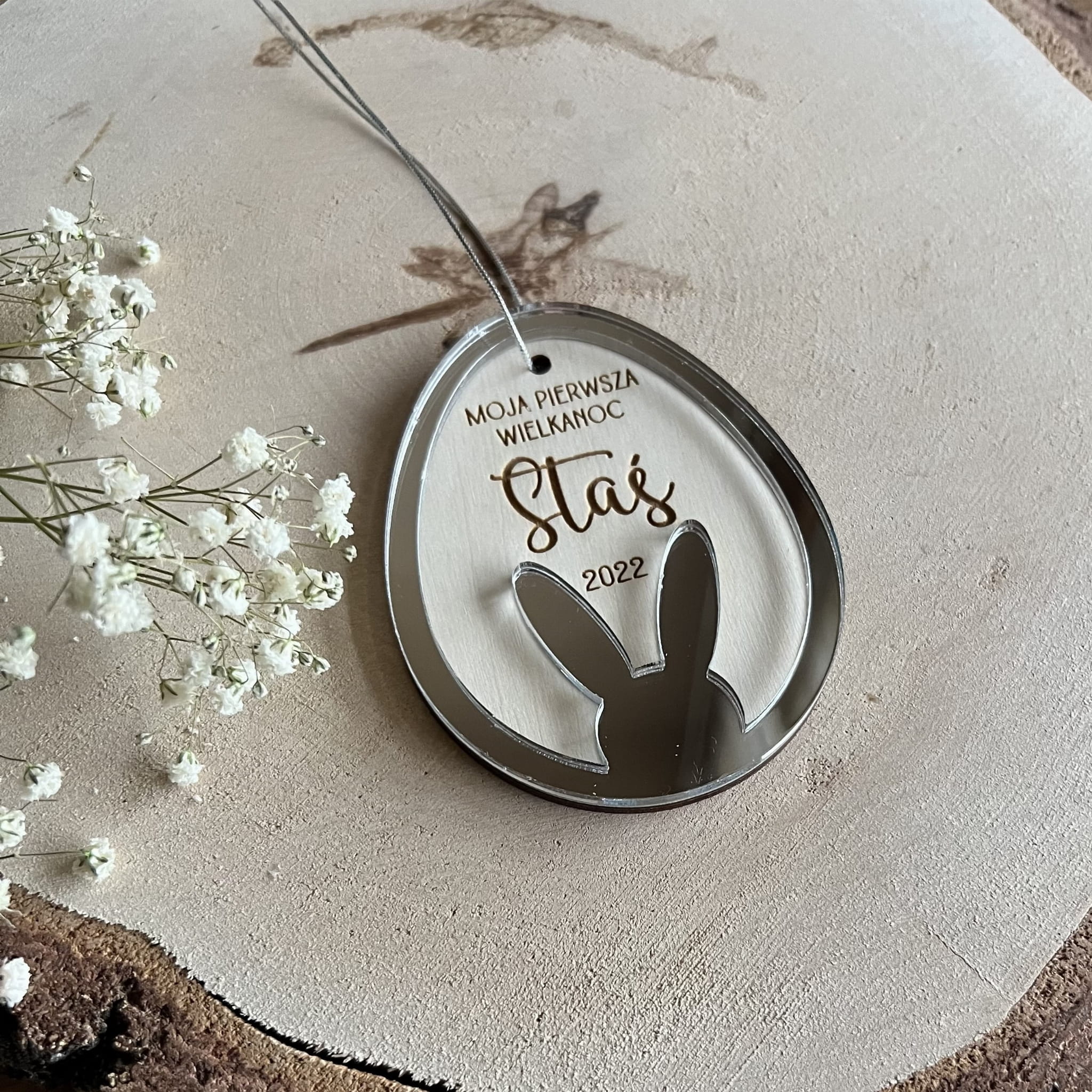 Zawieszka drewniana z ozdobną obręczą wykonaną z lustrzanego pleksi w kolorze złotym lub srebrnym.